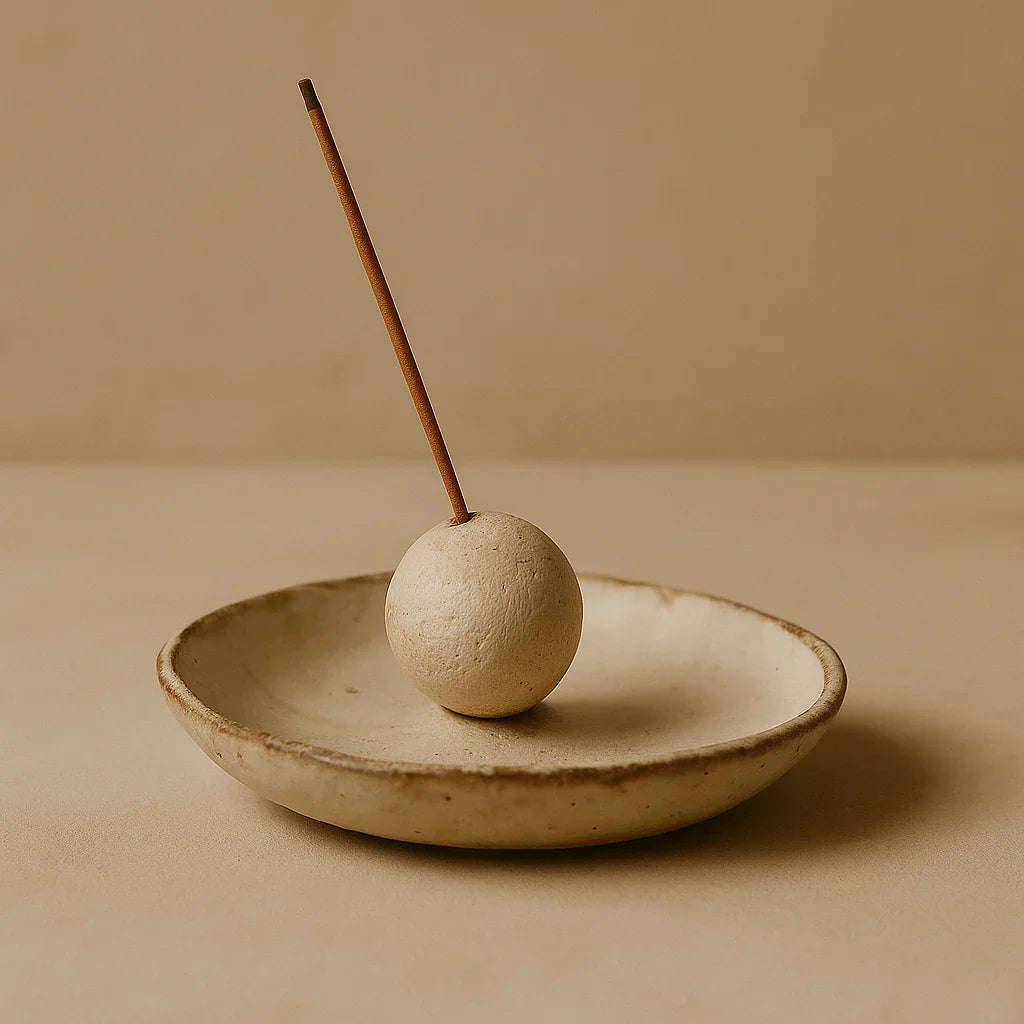 Enso (円相, "círculo de armonía" en japonés) es un porta sahumerio esférico de cerámica hecho a mano, pensado para sostener varillas de incienso en posición inclinada, permitiendo que el humo fluya con ligereza mientras la pieza recoge la ceniza con naturalidad.